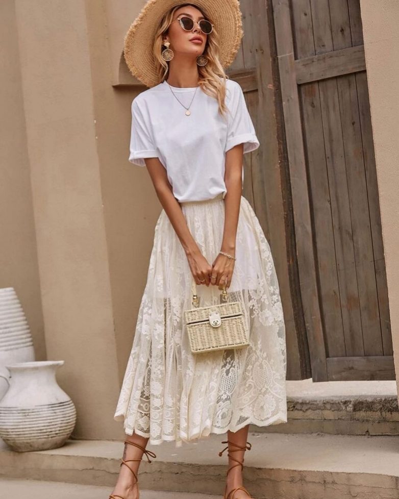 Кажется, что настолько романтичная деталь не сочетается с повседневными вещами. Это ошибочное мнение, кружевная юбка гармонично смотрится с футболкой. Футболку можно выбирать не только белую или пастельного оттенка, но и с ярким принтом – все зависит от вашего настроения.