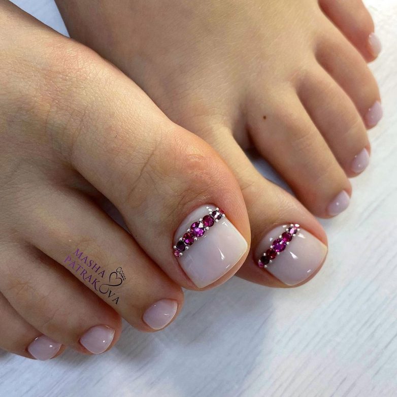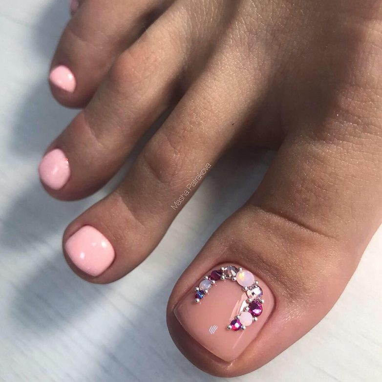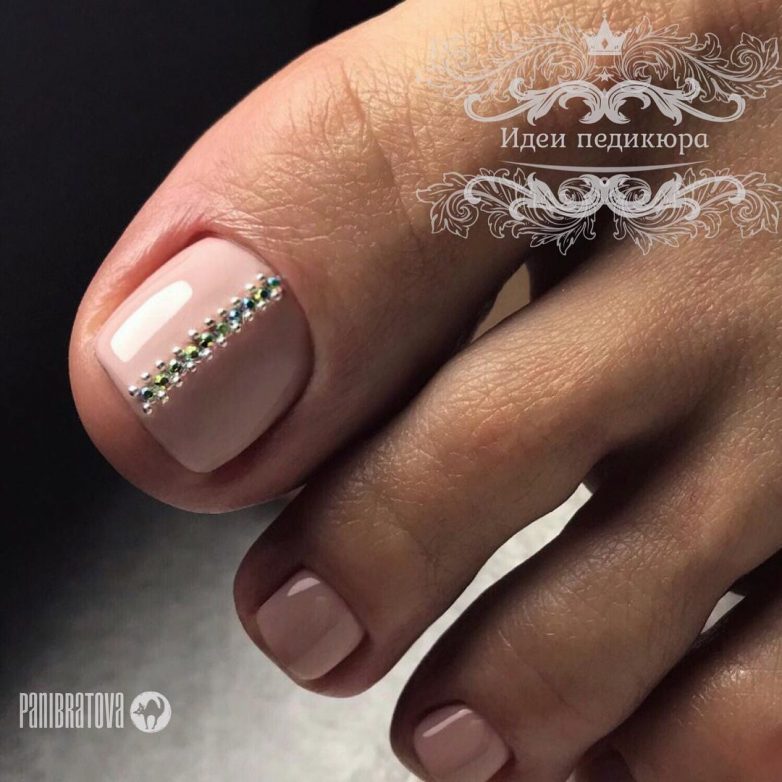 Пастельный педикюр уже является полноценным дизайном, который в принципе не требует дополнительного украшения. Но если вы желаете добавить в педикюр изюминку, тогда рассмотрите блестящие стразы. Можно выложить на большом пальчике красивый узор из страз или просто сделать главный акцент за счет объемного камушка.