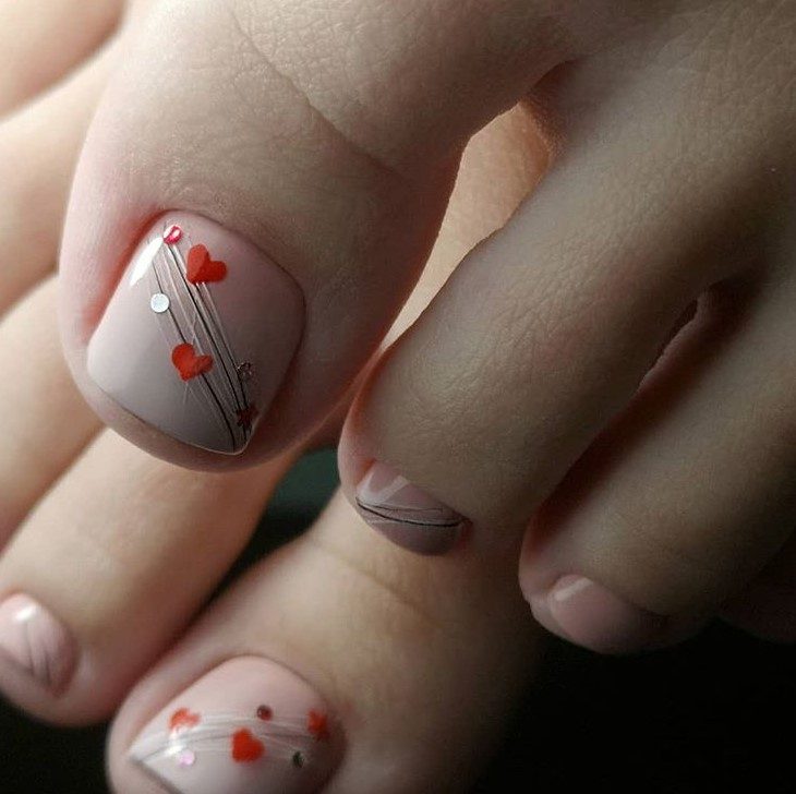На пастельном общем фоне очень красиво выглядят разнообразные рисунки. Конечно, от слишком сложных стоит отказаться. Лучше всего выбрать минимализм, контурные эскизы, небольшие наклейки и прочее. Кроме самого рисунка, в педикюр добавляют стразы, блестки и другие элементы нейл-арта.