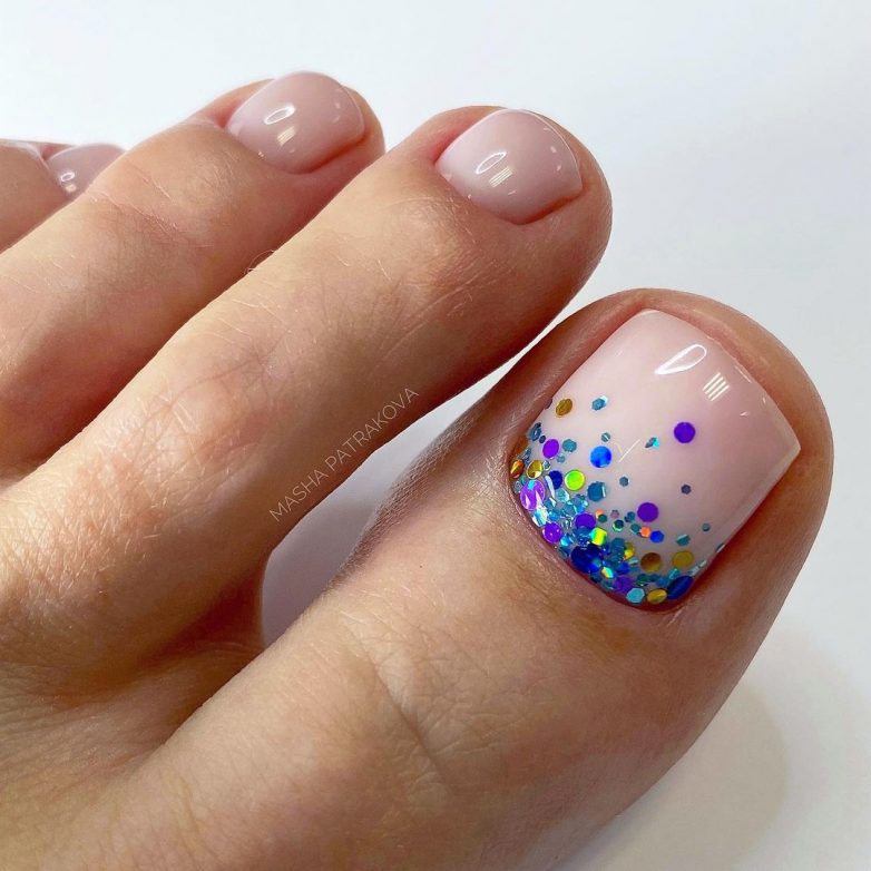 Эффектный и стильный дизайн ваших пальчиков получается за счет комбинации пастельного оттенка и ярких блесток. Можно выполнить педикюр в стиле колор блокинг, то есть часть ногтей покрасить в пастельный оттенок, а оставшиеся покрыть глиттером. Еще одна идея – блестки украшают только большой пальчик, а остальные покрыты пастельным лаком.