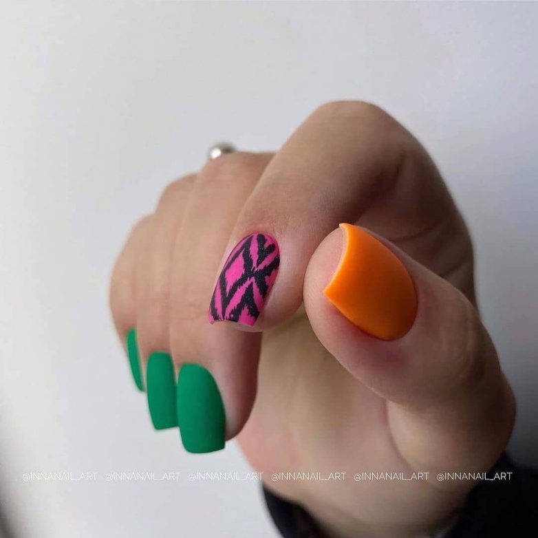 Такое оформление подчеркивает индивидуальность и создает шикарное настроение. Дизайн можно сделать с помощью фольги, страз, геометрических фигур, абстракции. Не менее эффектно выглядит маникюр «кошачий глаз». В моду вернулись животные принты.