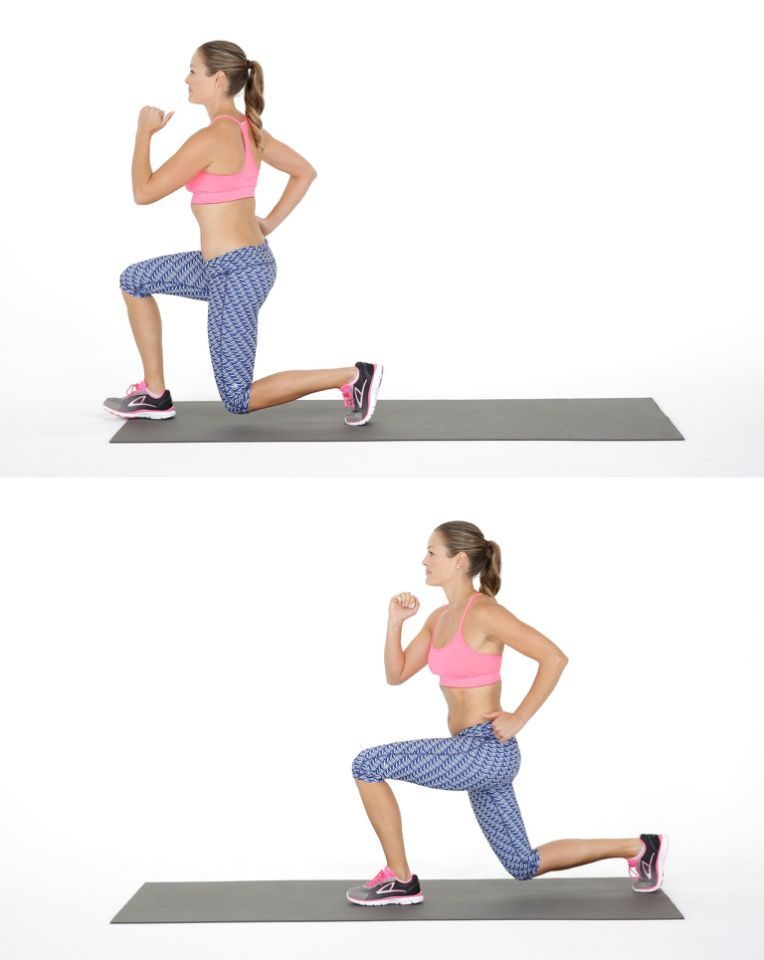 И. П. – стоя с ровной осанкой, ноги на ширине плеч, ладони на поясе. Сделайте шаг вперед и опуститесь, пока колено не коснется пола. Сохраняйте корпус прямым. Поднимайтесь и возвращайтесь в исходную позицию. Поменяйте ногу. Выполните 20 повторов каждой ногой. Можете взять гантели и увеличить количество повторов.