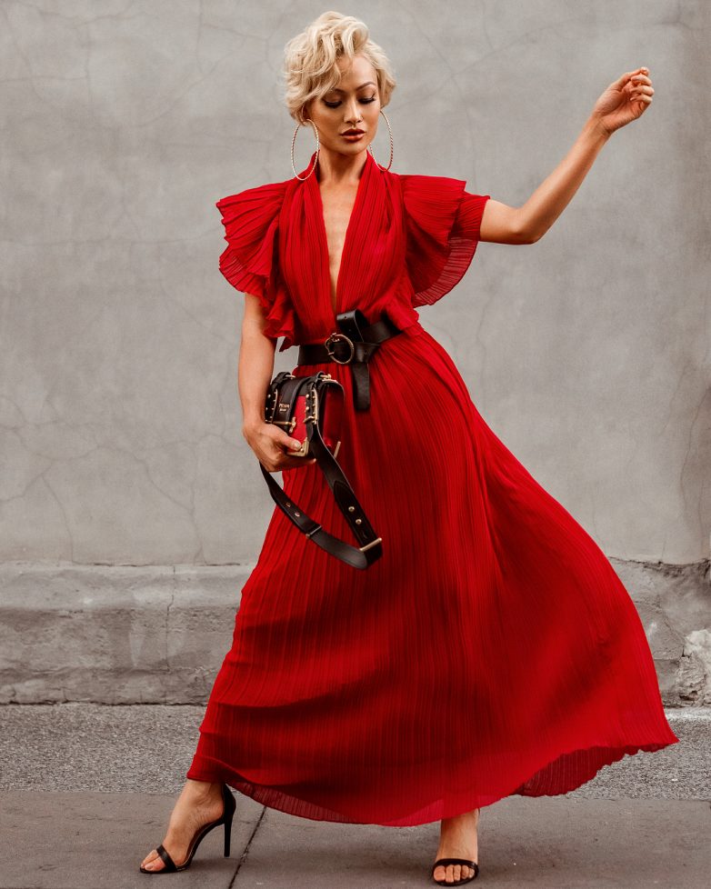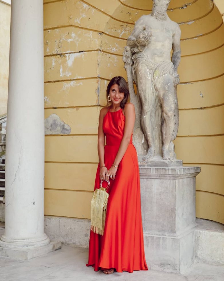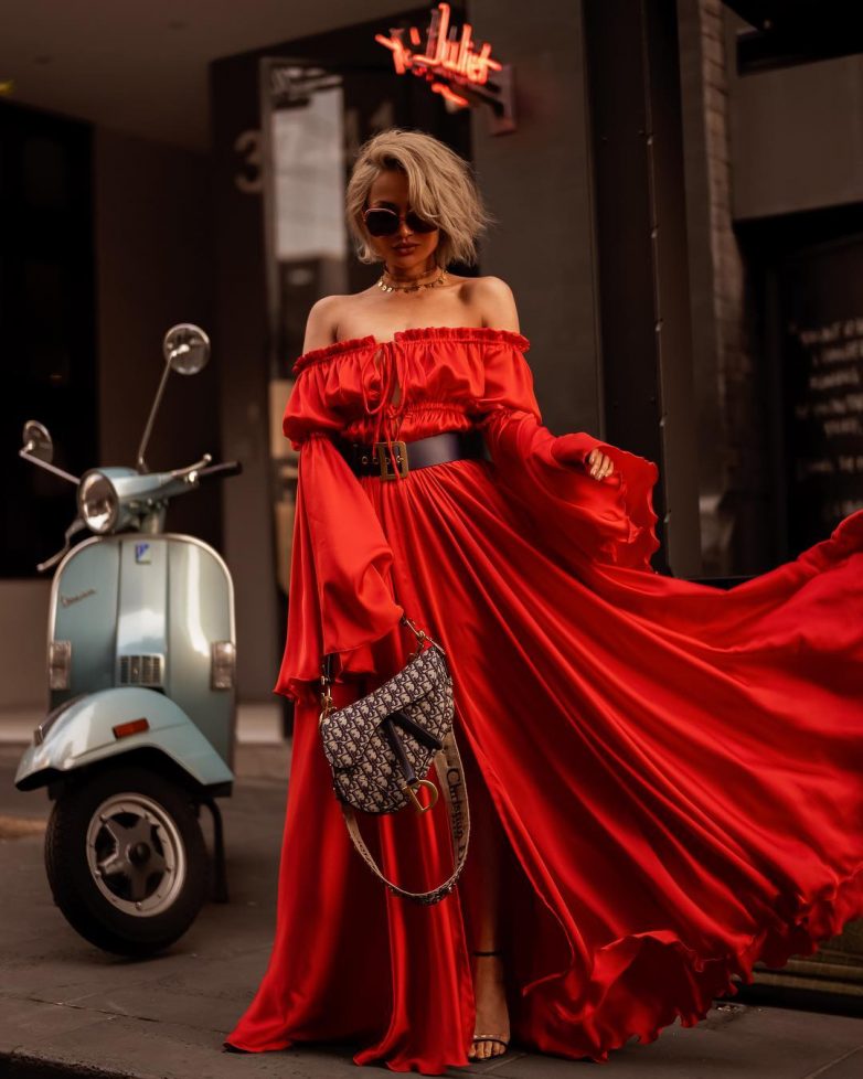 А элегантное красное платье в пол подойдет женщине, которая создает сет для торжественного мероприятия.