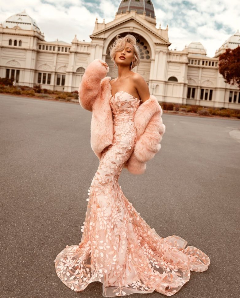 Особенный крой платья подчеркивает изысканную красоту модницы и позволяет создать очень женственный образ.