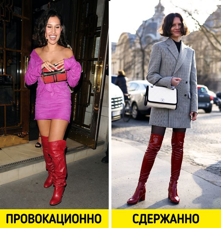 Носить ботфорты с мини рискованно, если вы идете на этот шаг, платье должно быть скромным, с закрытыми плечами. Верхняя одежда и вещи оверсайз немного «гасят» эффект от сапог и снижают градус игривости.