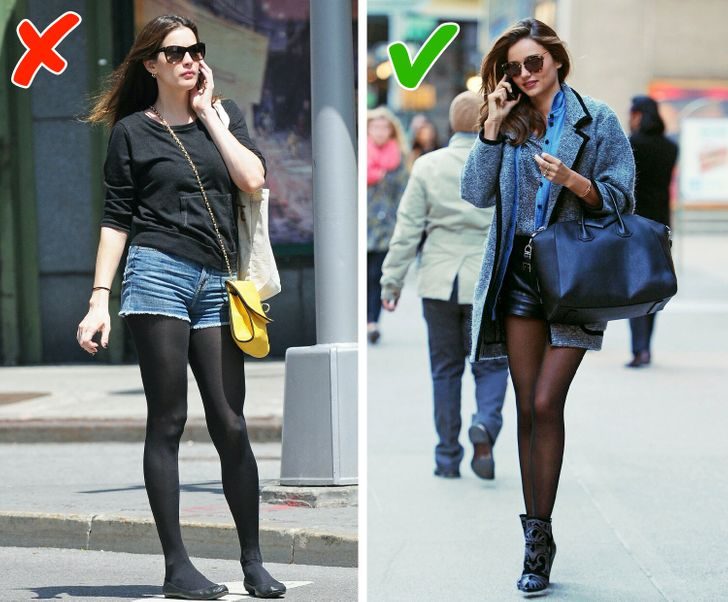 Избегать следует бежевых колготок с блеском или не подходящих по оттенку к коже. С черными же колготками можно запросто создать вульгарный образ, надев их, к примеру, со светлой или цветной обувью.