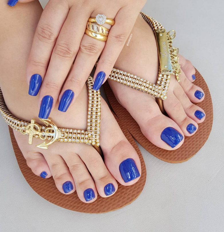 Глубокий и благородный синий оттенок украсит любой образ дамы. Чтобы внешний вид был самодостаточным, стоит покрыть синим цветом не только ногти на руках, но и на ногах. Благодаря единому стилю, модница получит очень много приятных комплиментов.