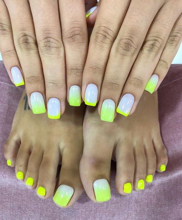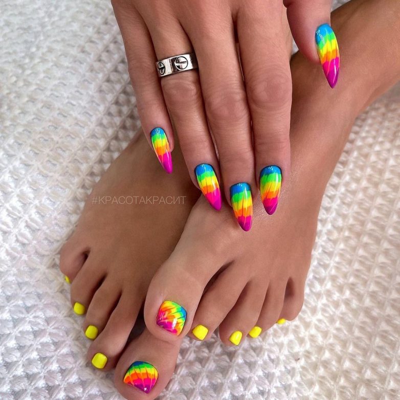 Модный дизайн омбре активно используется дамами для украшения своих ножек и ручек. Для создания яркого стиля можно выбрать самые сочные и неоновые оттенки, а для нежных леди подходит омбре в пастельных тонах.