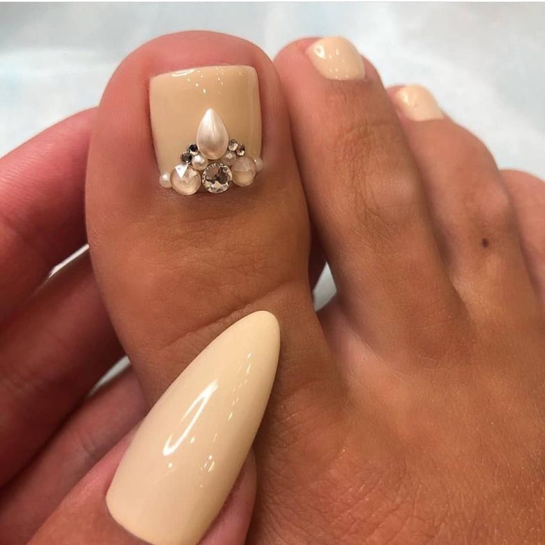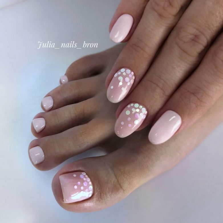 Самым подходящим оттенком для маникюра и педикюра в одном стиле является нежный нюд. Он позволяет выбирать разные дизайны с вставками нейл-арта. Так вы можете покрыть ногти на руках и ногах в нюдовый тон и добавить в него несколько блестящих деталей. Очень красиво в матовом нюдовом маникюре и педикюре выглядят несколько страз на одном ногте.