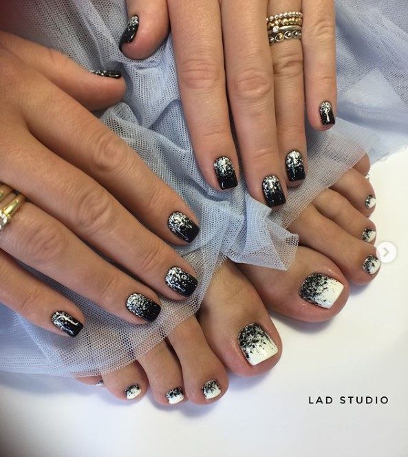 Черный маникюр и педикюр в одном стиле