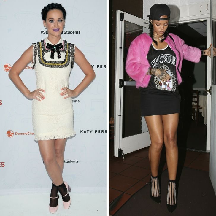 То же самое касается и женского стиля. Носить сандалии, босоножки и туфли с носками — современный тренд. Сегодняшняя мода заботится о комфорте и гигиене. Многие звезды, например Кэти Перри и Рианна, не стесняются продемонстрировать носки в сочетании с женственной обувью.