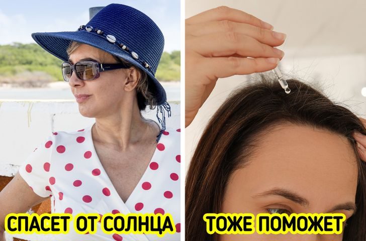 Чтобы максимально защитить волосы от воздействия солнца, их можно собрать в пучок и убрать под шляпку или кепку. А тем, кто предпочитает носить распущенные волосы, нужно позаботиться о защите и к обычному уходу за волосами — шампунь, бальзам, маска — прибавить специальные несмываемые спреи.