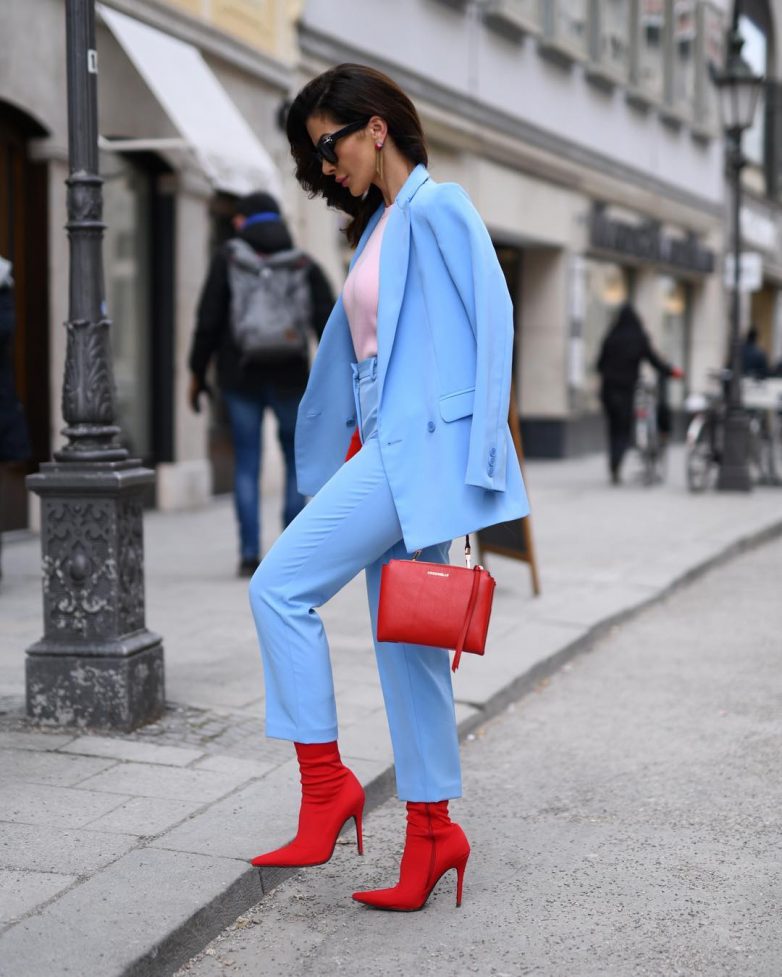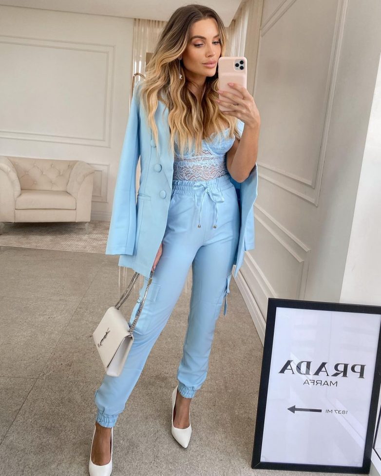 Идеальным решением станет монохромный образ с голубыми брюками. Также можно собрать и абсолютный тотал лук в голубом цвете. Такой образ подойдет для работы, официальных встреч и свиданий. Особенность голубого монохрома в том, что он дополняет образ дамы, создает совершенный и приятный внешний вид.