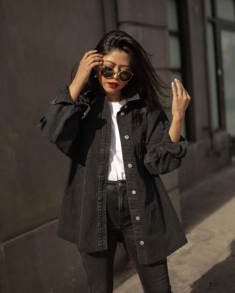 Современные модницы для создания уличных образов выбирают модный вариант черной рубашки в стиле оверсайз. Она такая же практичная, как и классический вариант, но при этом более удобная и оригинальная. Несмотря на ее свободный крой подходит рубашка самым худеньким красавицам, которые желают подчеркнуть хрупкость своей фигуры. Обычно такую рубашку заправляют лишь спереди, чтобы придать образу немного неряшливости. В качестве низа подходят джинсы и шорты, легинсы и узкие брюки.