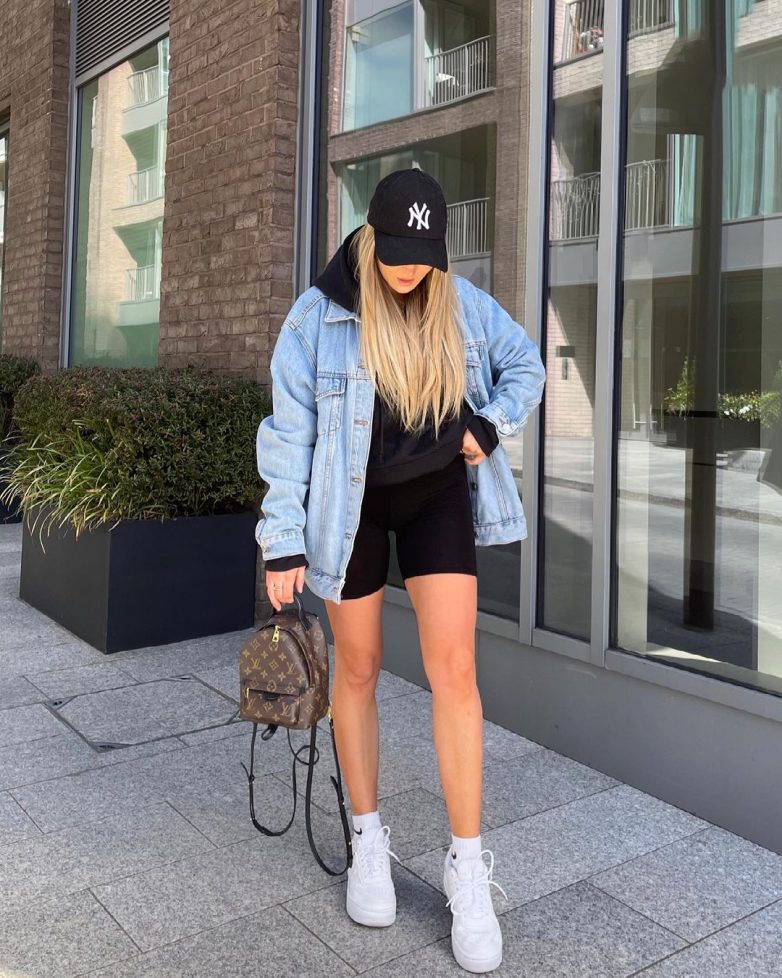 Небывалой популярностью пользуются стильные джинсовки оверсайз. Их объемный вид позволяет девушке подчеркнуть свою хрупкую фигуру. Носить эту модель можно не только со спортивными вещами, но и с более женственными изделиями, например, укрученным худи в виде платья. Но с обувью лучше слишком не мудрить, выбирайте кроссовки, чтобы джинсовка смотрелась в образе гармонично.