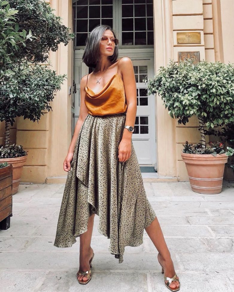 Тип №4. Фактурная асимметричная юбка + босоножки на маленьком каблуке