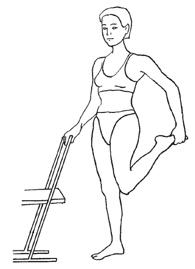 Для мышц ягодицы и передней поверхности бедра.Встаньте около спинки стула или другой опоры. Оптимальная высота опоры — положение между талией и грудью. Слегка придерживайтесь за опору, чтобы не потерять равновесие во время выполнения упражнения;