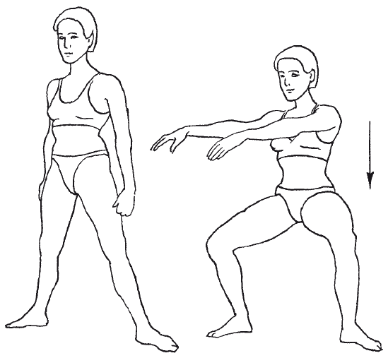 Великолепно дополняет упражнение 2.Примите положение широкой стойки (см. рис.). Ноги врозь, стопы развернуты;
