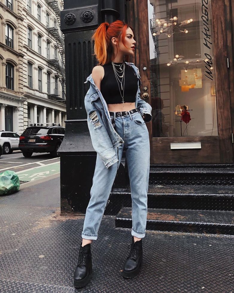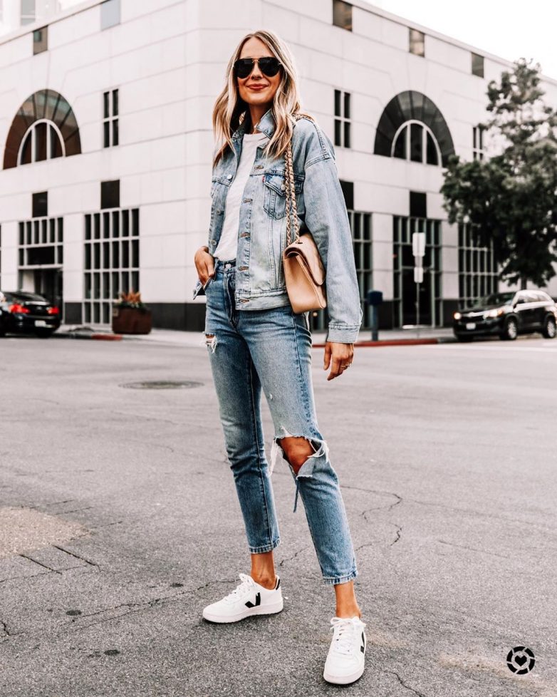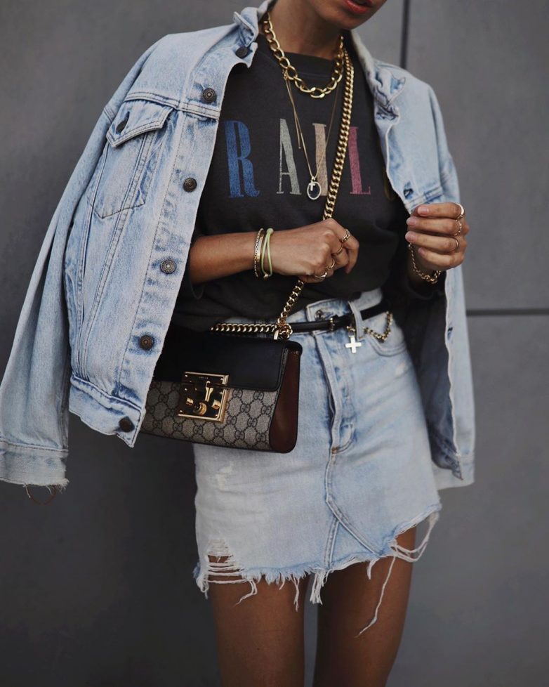 Модная джинсовка – это деталь полноценного современного образа в уличном стиле. Под нее можно выбрать совершенно любой лук. Для прогулки выбирают теплую худи, легкую юбочку мини и симпатичные аксессуары.