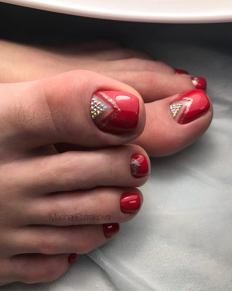 Для летнего педикюра или торжественного образа дамы выбирают самый яркий педикюр. Красочная деталь позволит сделать главный акцент в образе, который собран с особым вниманием. Модницам очень понравится идея яркого педикюра, в котором выделена часть лунки. Ее можно сделать в прозрачной форме или закрасить в другой цвет.