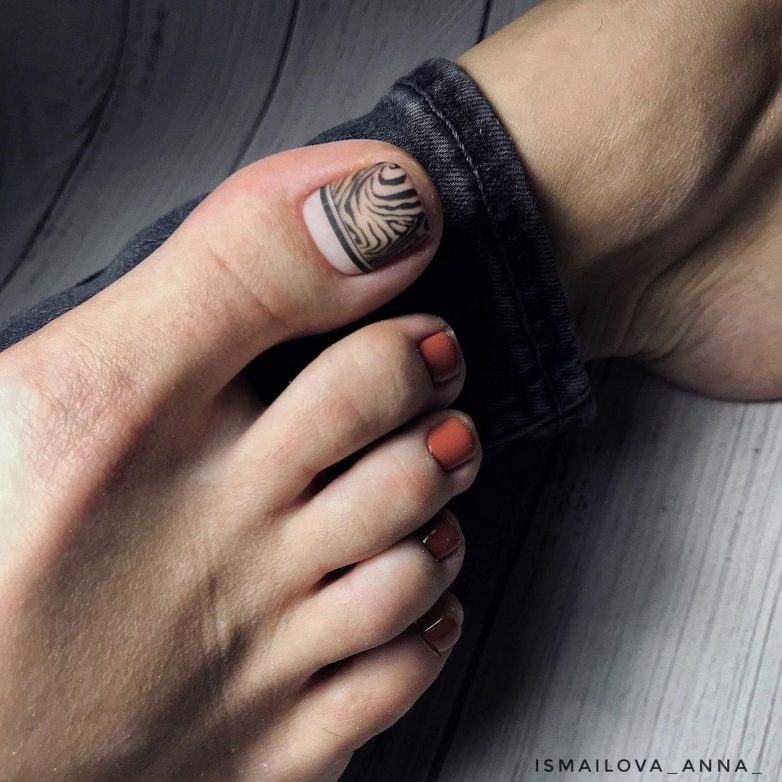 Мастера нейл-арта предлагают дополнить лунный педикюр оригинальными рисунками. Если это дизайн для нежной леди, то отличным решением станет кружево или узоры. С лунным педикюром отлично выглядят и более сложные рисунки, например, животный принт или художественная роспись.