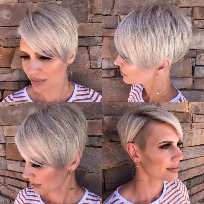 Стильная и дерзкая стрижка позволит сбросить визуально добрый десяток лет. Она поможет создать привлекательный образ деловой женщины, а авангардный вариант с ирокезом и выбритыми висками подойдет для творческих натур. Челка может быть максимально короткой, приподнятой с помощью мусса или геля. Можно оформить и удлиненную косую челку, которая поможет замаскировать нечеткий овал лица.