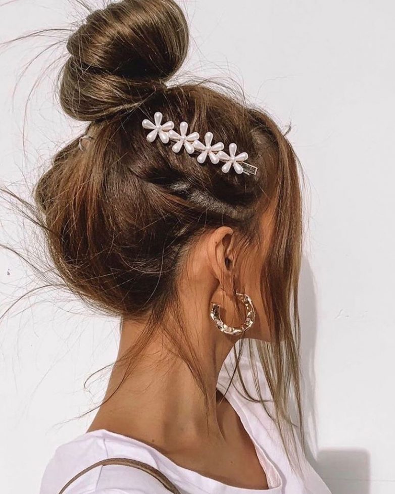 Еще один вариант модной деловой укладки. Пучок – простая прическа, которая открывает лицо женщины и позволяет ей чувствовать себя свободно. Только стоит знать, что укладка тугой пучок уже давно стала антитрендом, сегодня мега популярен пучок в немного хаотичном и легком виде с выбивающимися прядями.