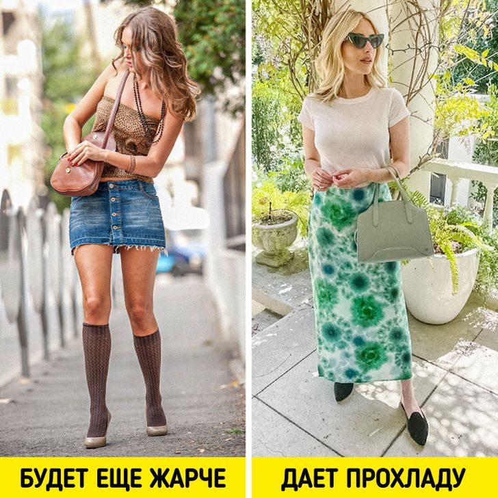 Вопреки расхожему мнению, вещи, обтягивающие тело, хоть и открывающие большие его участки, не спасут от жары. Выбирайте лучше закрытую одежду свободного кроя и из натуральных тканей. Свободное платье макси даст телу больше прохлады, чем обтягивающий топ и мини-юбка.