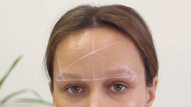 Теперь необходимо вырисовать линию сгиба хвостика бровей. Чтобы её нарисовать, нужно провести линии, которые пройдут через наивысшую точку бровей и пересекутся в центре лица.