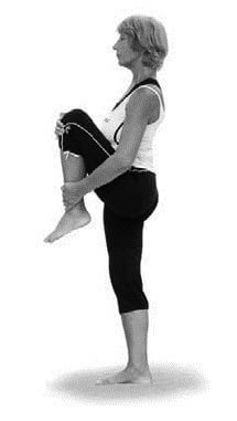 1. Стоя поднять ногу, согнутую в колене, к груди.
