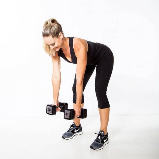 Для этого упражнения тебе понадобятся гантели. Встаньте прямо, в каждую руку возьми 1 – 1,5 килограммовую гантель и расположи их впереди. Наклоняйся вперед от талии до суставов пальцев, касаясь пола. Вернись в исходное положение. Повтори упражнение 30 раз.