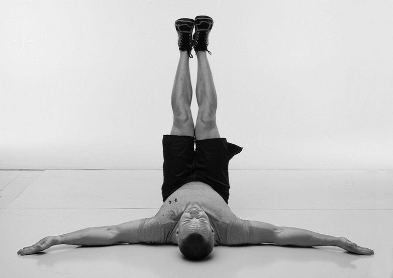 Исходное положение: лежа на спине, ноги сведены вместе и подняты вверх (перпендикулярно полу). Разведите руки в стороны и прижмите их к полу.