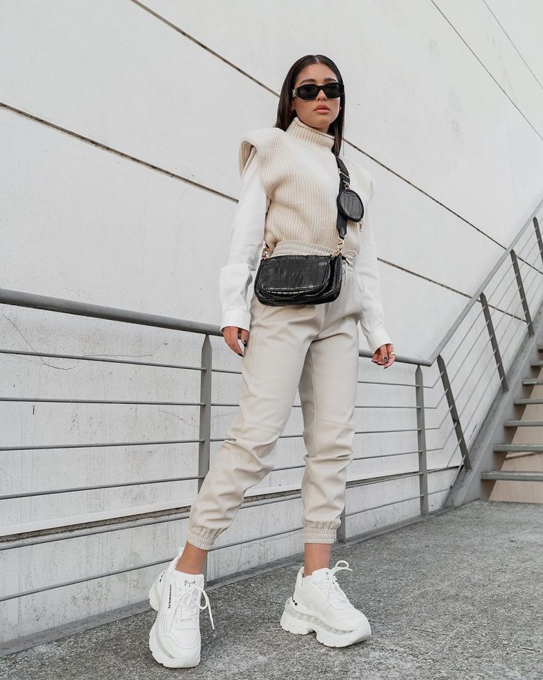 Кроссовки на платформе можно сочетать с брюками спортивного стиля, с брюками с лампасами, зауженными к низу или прямыми моделями из хлопка, трикотажа. Иногда вещи кажется не сочетаются, например, брючный костюм и массивные кроссовки, но в таких нарядах появляются звёзды и иконы стиля, и со временем даже такое сочетание кажется уместным в обычной жизни.