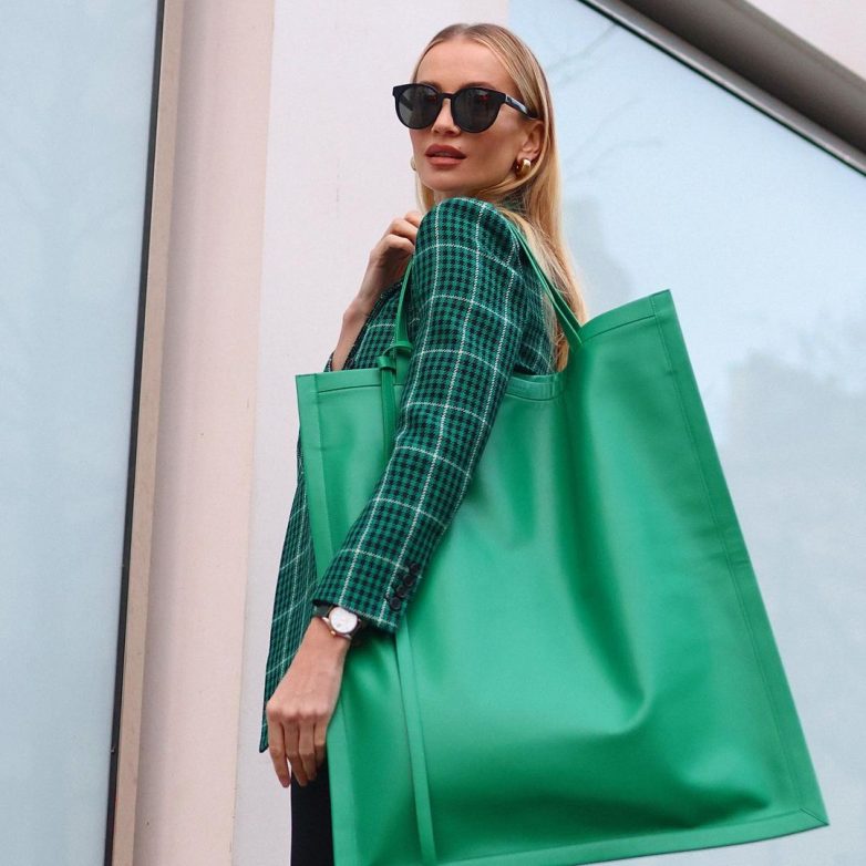В современном мире сложно представить, что женщина может выйти из дома без сумки. Так как пиджак в клетку расставляет акцент в образе, сумку лучше выбирать без рисунков. Допускается клеточный принт на миниатюрных сумках. Это единственное исключение. Стилисты рекомендуют подбирать однотонные сумки в цвет клетки. Создается единый ансамбль, который подчеркивает прирожденный безупречный вкус дамы.