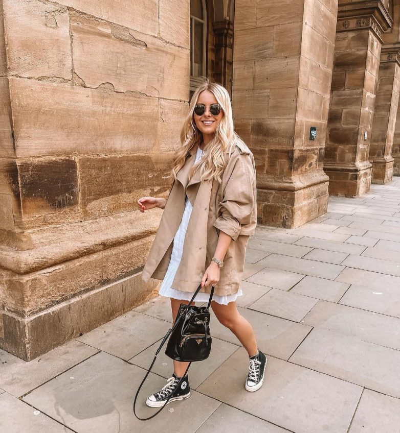 На начало осени, когда погода нас еще радует теплыми деньками, стоит к свободному платью добавить тренч. Классическая бежевая модель или в стиле оверсайз отлично подходит к платью в свободном стиле. Если выбрать в качестве обуви кроссовки или кеды, то образ будет полностью соответствовать модному кэжуал стилю.