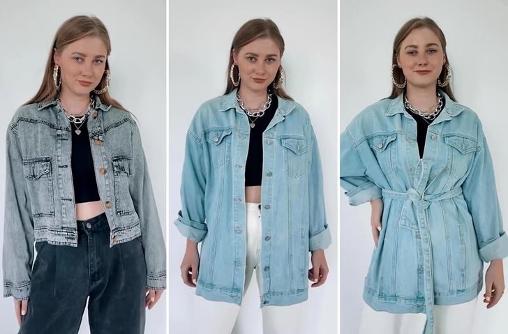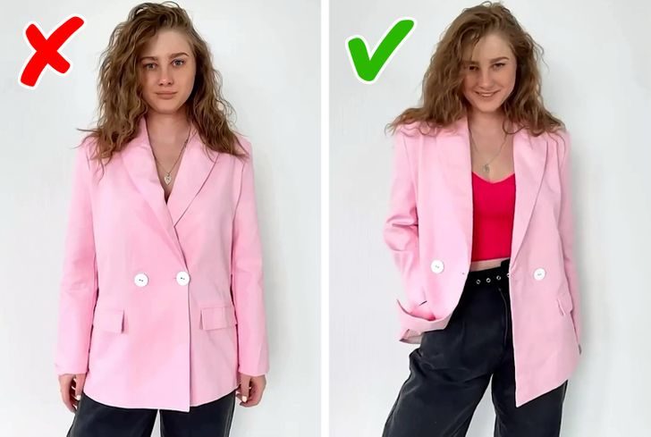 Застегнутый жакет со слоучами увеличивает бедра. Широкий ремень, кроп-топ и расстегнутый жакет — лучшее сочетание для этого образа.