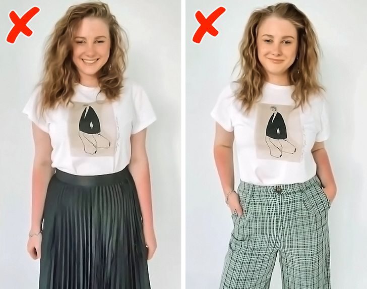 Широкие модели джинсов (слоучи) подходят далеко не всем. Защипы в зоне живота и объемный крой могут визуально увеличить верхнюю зону, «смазать» линию талии, если она не достаточно выражена, и сделать акцент на животе.