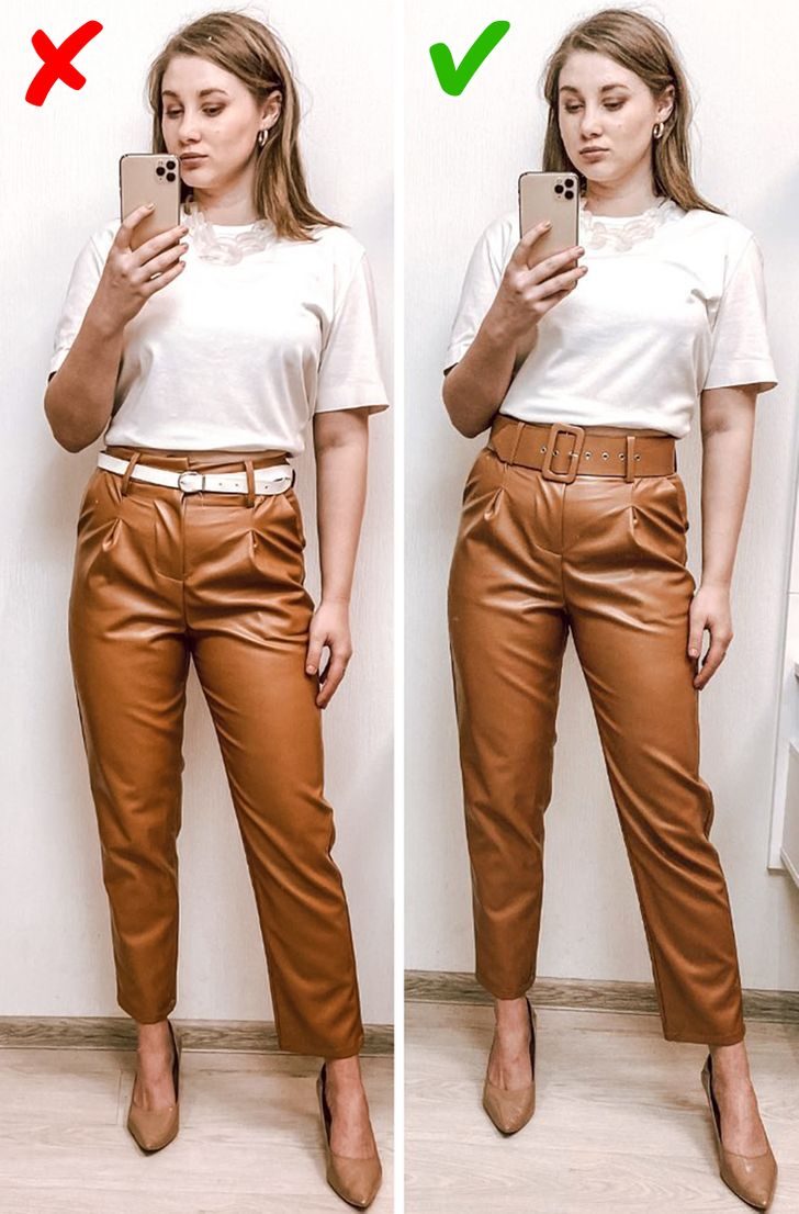Широкий пояс в тон брюкам не только акцентирует линию талии, но и удлиняет ноги. Контрастный тонкий пояс визуально сделает талию шире и укоротит ноги.