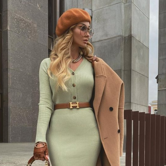 Забудьте о скучных черных, синих и серых цветах, эта осень должна быть яркой во всех смыслах. Обзаведитесь трикотажным платьем длиной миди с модными пышными плечами в желтой, бирюзовой или пурпурно-фиолетовой гамме. Оно будет выглядеть немного в стиле ретро, изысканно и элегантно. Из аксессуаров можно подобрать широкий кожаный ремень, крупные серьги или массивные цепи в золоте или серебре.