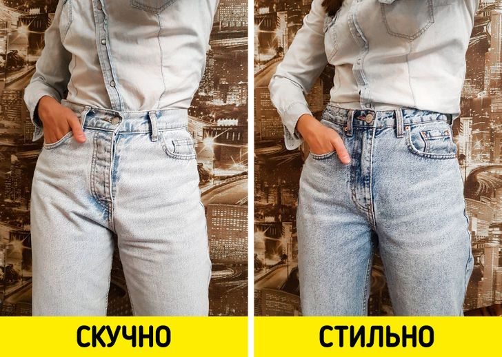 Джинсы с завышенной линией талии в тренде уже не первый год, такие модели выглядят стильно и удобны в носке. Однако если у вас есть любимая пара джинсов со средней посадкой, их тоже можно надевать. Не стоит натягивать такие джинсы до пупа и затягивать ремнем для лучшей фиксации. Даже пара сантиметров такой натяжки обеспечат некрасивые складки между ног.