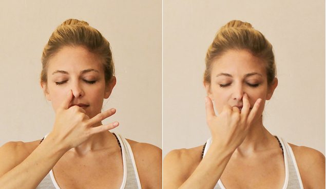 Схема такова: левая ноздря прикрыта, левая и правая прикрыты, правая прикрыта, выполнить еще раз.