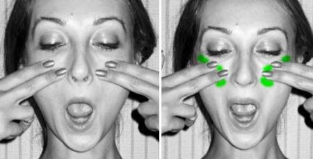 Приоткрываем рот, вытянув губы в форме буквы О и прижав верхнюю губу к зубам. Указательные пальцы размещаем по нижнему краю глазниц. Растягиваем уголки рта и вновь вытягиваем губы в форме О, ощущая напряжение мышц под подушечками пальцев. Всего — 20 повторений.