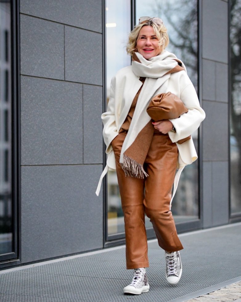 Как стильно носить палантин и кожаные брюки