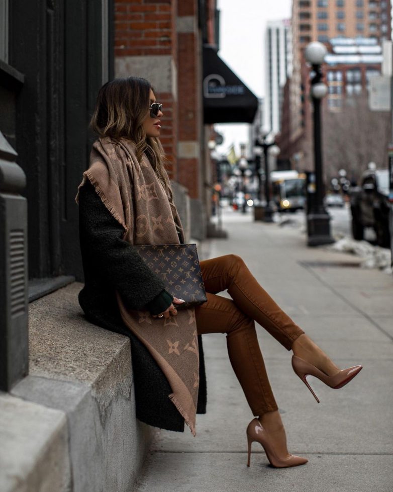 Шарф палантин в первую очередь подбирается в зависимости от общего стиля, а уже потом выбирается обувь. В то же время палантин можно включать практически в любой образ дамы. К примеру, деловой стиль с обувью на каблуке можно дополнить однотонным палантином, а уличный стиль с грубыми ботинками и классическим пальто украсить очень длинным экземпляром шарфа.