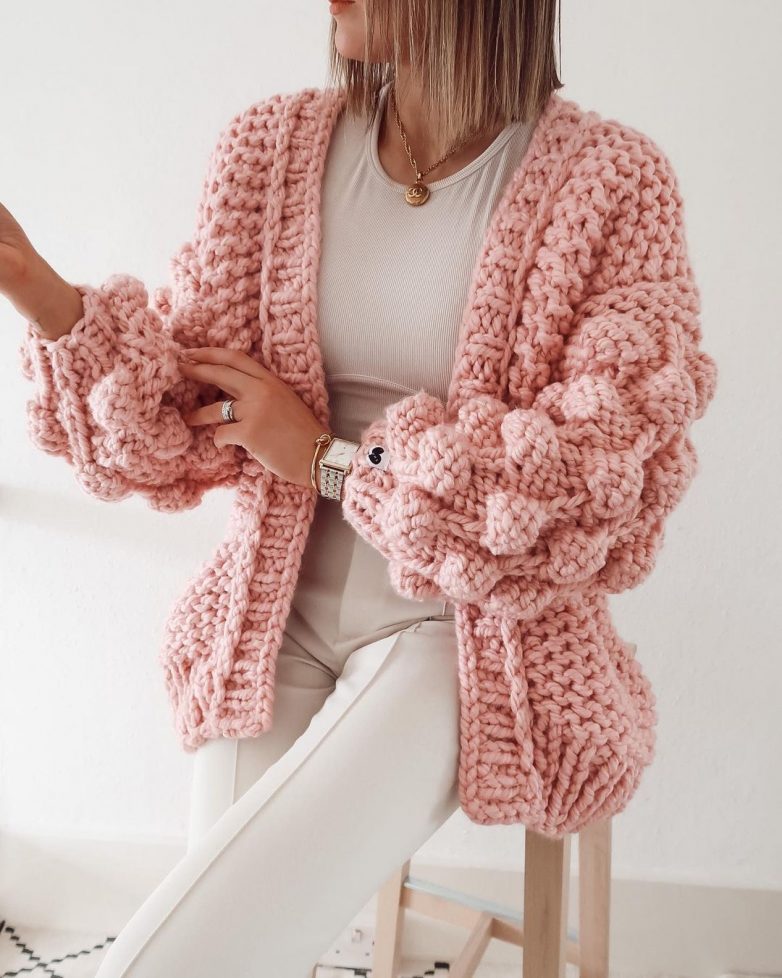 Самой популярной и востребованной вещью осенью остается кардиган. Практичность, удобство вязаной вещи дает возможность убрать другие варианты верхней одежды. Особое внимание уделяйте вязаным узорам кардигана, оригинально выглядит рельефный рисунок, а также косы, листочки и бессменная объемная вязка.