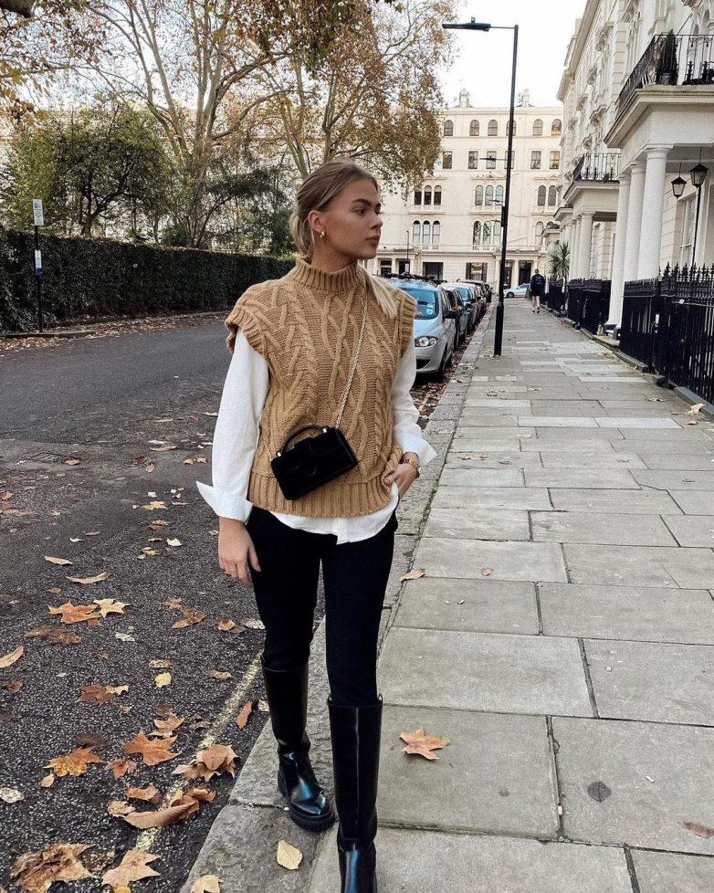 Невероятно повысился спрос на разнообразные жилеты, безрукавки. По сути, это привычная вещь, только без рукавов. Как раз вязаный свитер без рукавов стоит добавить в базовый гардероб. Отлично фасон смотрится с белыми рубашками, выбирают не только классические приталенные, но и свободные и в стиле оверсайз. Свитер без рукавов подбирают как в цвет образа, так и в крупных узорах или в ярком оформлении.