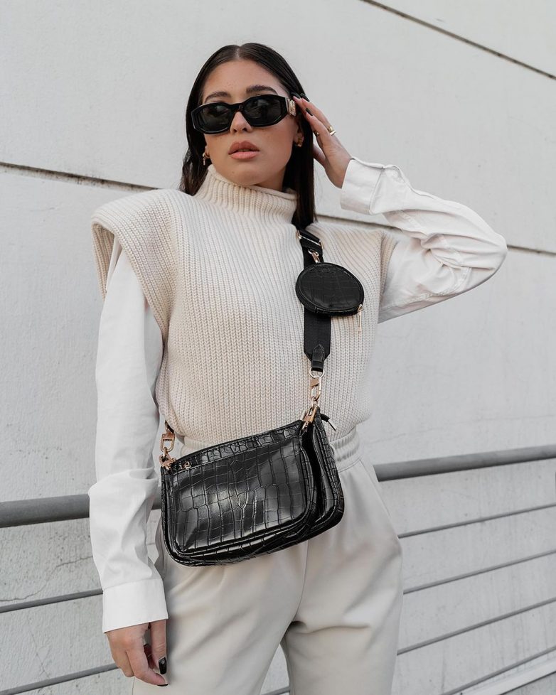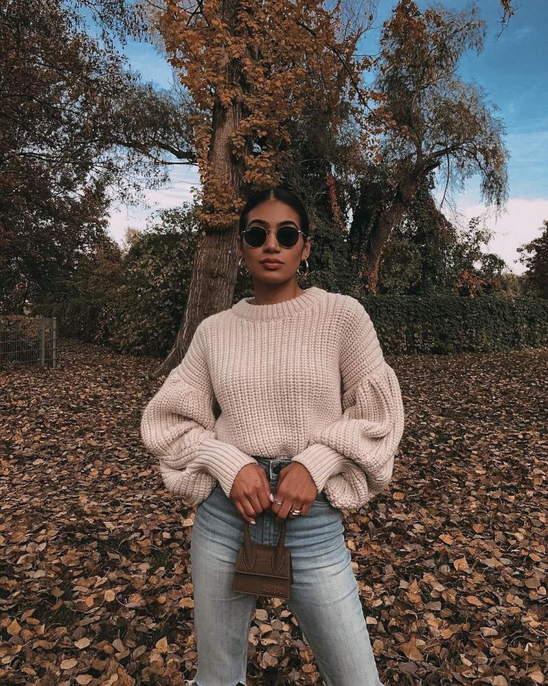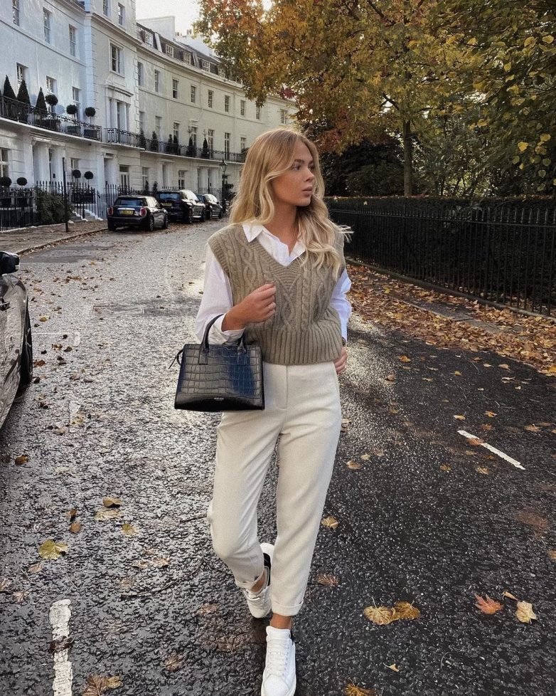 Осенью нужно дополнить свою капсулу свитером в белом цвете. Причем выбирать классический фасон в спокойном узоре. Такой свитер пригодится для создания образов на работу, если вниз надеть брюки со стрелкой или юбку в традиционном фасоне. Для неформального ансамбля белый свитер стоит совместить с джинсами, а на свидание выбрать образ с белым свитером и кокетливым платьем.