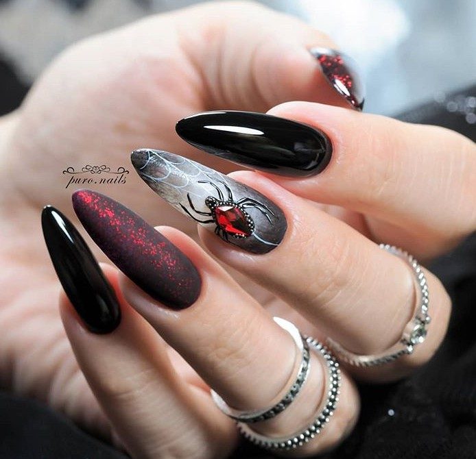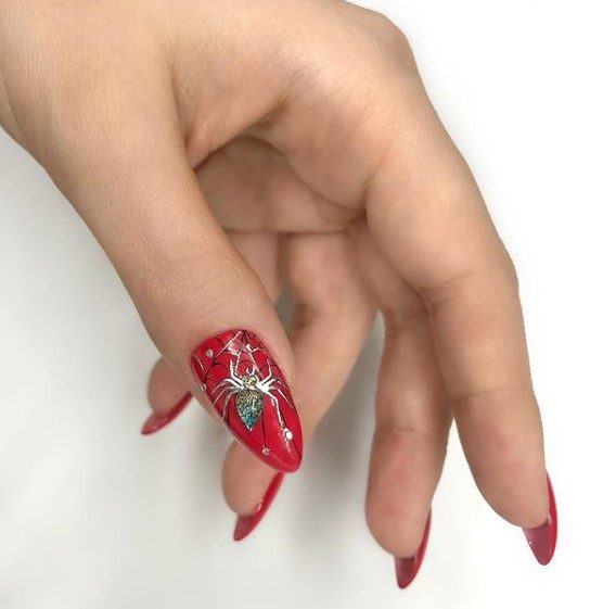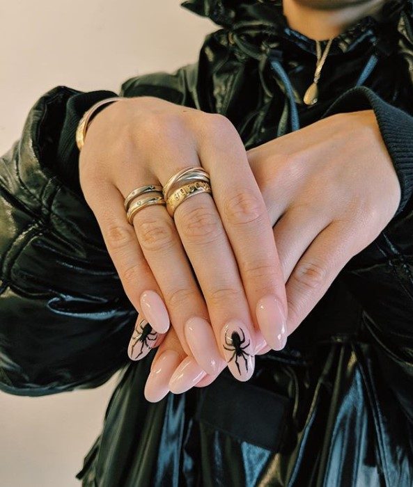 Эксперименты с маникюром интересно смотрятся. Уже давно приемлемо красить ногти разными цветами. Паук не затеряется, а станет красивой завершающей деталью в образе.