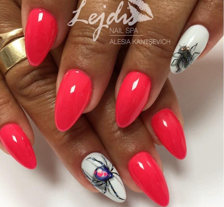 Это оформление ногтей сразу привлекает внимание. Оно выглядит кокетливо, но не вульгарно. На одной руке нарисован паук, а на другой ‒ муха. Такой выбор не разрушает единый стиль и раскрашивает серые будни 3-D эффектом.