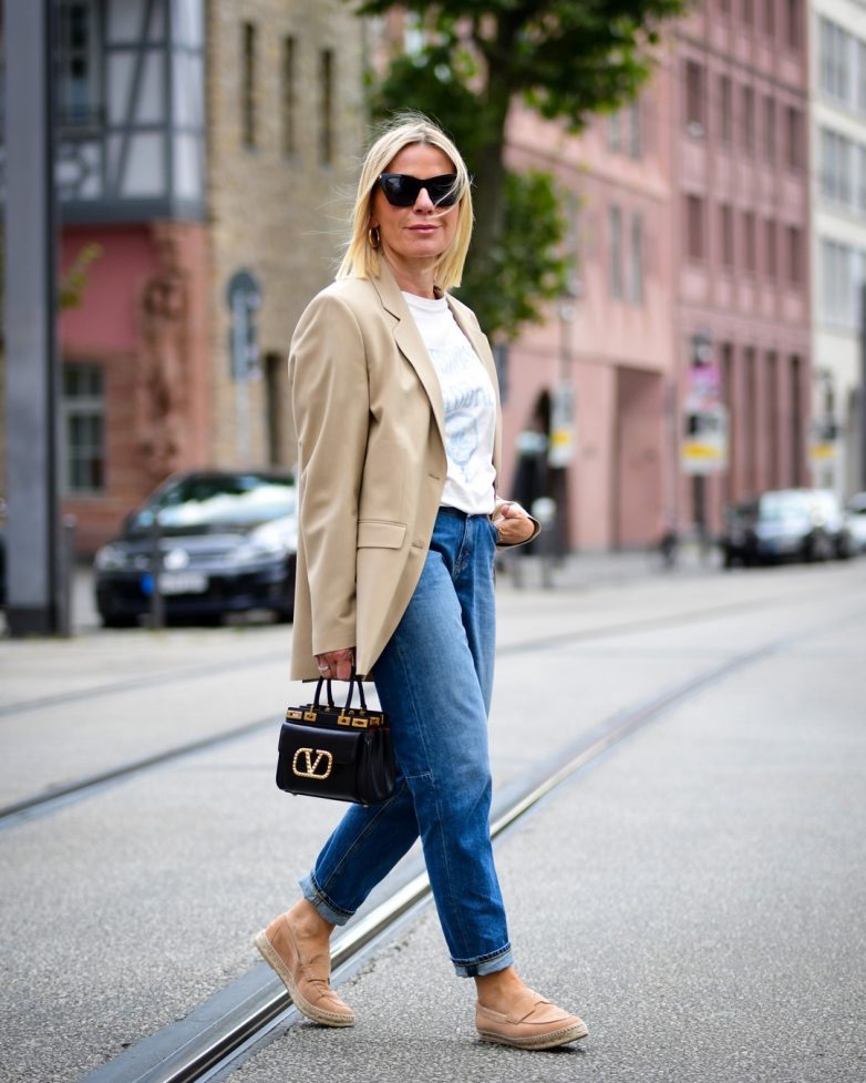 Женщине после 40 лет необходимо облагородить свой образ с джинсами. Такой подход к стилю позволит неформальный имидж перевернуть с ног на голову. Разбавляйте джинсы яркими акцентами в виде симпатичных сумочек, платков, шарфов, солнцезащитных очков. Не всегда к джинсам подходят ваши любые кроссовки, точнее, они идеально выглядят в этом тандеме, но пробуйте и другие креативные варианты. Кеды с животными принтом, яркие туфли, удобные ботинки – не останавливайтесь только на одной модели обуви.